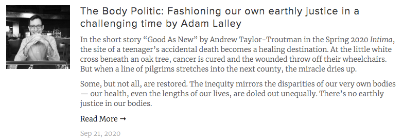 Featured Guest Blogger @ IntimaAdam LalleyOct 16, 20201 min readIn September, I was honored to be featured as a guest writer on Intima's Crossroads Blog, in which I shared some thoughts that were inspired by a short story in the Spring issue. Click below for more.